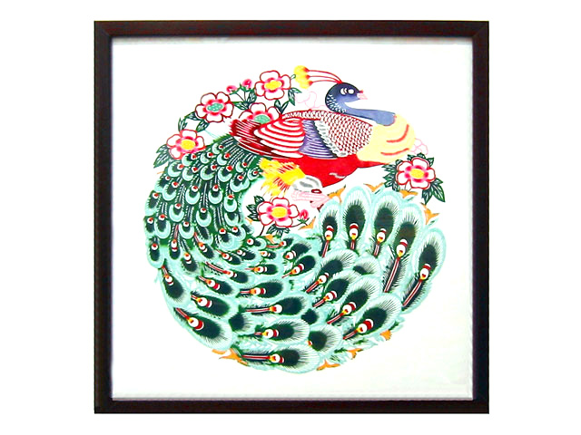 孔雀の羽がとても綺麗に色づけされており、きり絵も繊細に仕上げられています。