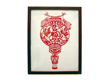 中国の伝統的な灯篭の形で、中に”福”の字、鶴(長寿)、梅(厳しい寒さに耐えながら咲く),松(常緑)があり、下に魚(豊か)がいます。