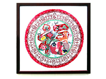 福と言う字を、蝙蝠、鹿、鶴、松、蓮、魚、如意など、おめでたい言葉・動物や植物を使って、出来たきり絵。