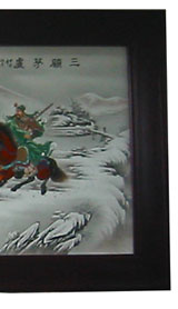 三顧の礼の壺も同じ図案で、壺か絵の違いと関羽の服の色が違うだけですので、壺のほうも参考に見てみてください。