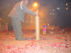 この写真は、清掃係が来て、掃除をしているのではありません。 この人何をしているかと言うと、打ち上げ花火の空箱を集めているんです。 そんなのどうするんだ?と思う人も居るかもしれないが、 日本でも新聞や雑誌が売れるように、中国でも、新聞や紙は、立派な資源。 これを回収して、売れば少しだがお金にすることが出来る。 |