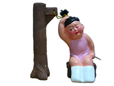 戦国時代の蘇秦は、若いときに眠くなると、腿にキリを刺して眠気を払って勉強し、漢の孫敬は首に結んだ紐を天井の梁に掛けて休まずに学んだという故事からの作品。