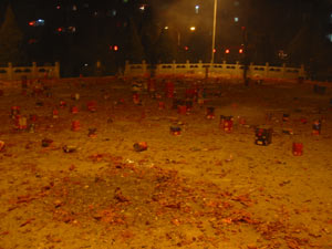 一度、夜空を見ると凄い、凄いの一言に尽きる。 花火の数が桁違いだ。360度どこの空を見ても、花火、花火、花火・・・ 日本でやる花火が子供の遊びの様に思えるほど、打ち上げ花火、爆竹の数、規模がすごい。 すぐ目の前でドンドン打ち上げているので、真上で花火が花を咲かせる。 日本で見る花火と迫力が違し、友達の声が全く聞こえない! 花火の残りカス(紙)が、上から次から次へ降って来た。 |