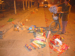 この写真は、清掃係が来て、掃除をしているのではありません。 この人何をしているかと言うと、打ち上げ花火の空箱を集めているんです。 そんなのどうするんだ?と思う人も居るかもしれないが、 日本でも新聞や雑誌が売れるように、中国でも、新聞や紙は、立派な資源。 これを回収して、売れば少しだがお金にすることが出来る。 |